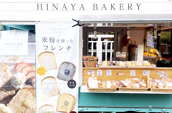 綾町でお米の生産からパンの製造まで自社で行いキッチンカーで販売しているHINAYA BAKAERY。人気の「ふわとろフレンチトースト」6種類のほか、米粉丸パン、米粉丸パンチーズ、塩パン、クッキーメロン、ラスクなどがそろっています。